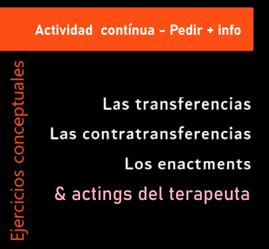 Enviar consultaVer + Click aquí El campo dinámico como teatro de operaciones. Transferencia, contratransferencia y enactmentEl encuentro psicoterapéutico es dinámico. Los pacientes nos movilizan, producen efectos en nuestra subjetividad generando respuestas concientes e inconscientes. Te invitamos a explorar en un breve taller en torno al campo transfero-contratransferencial.